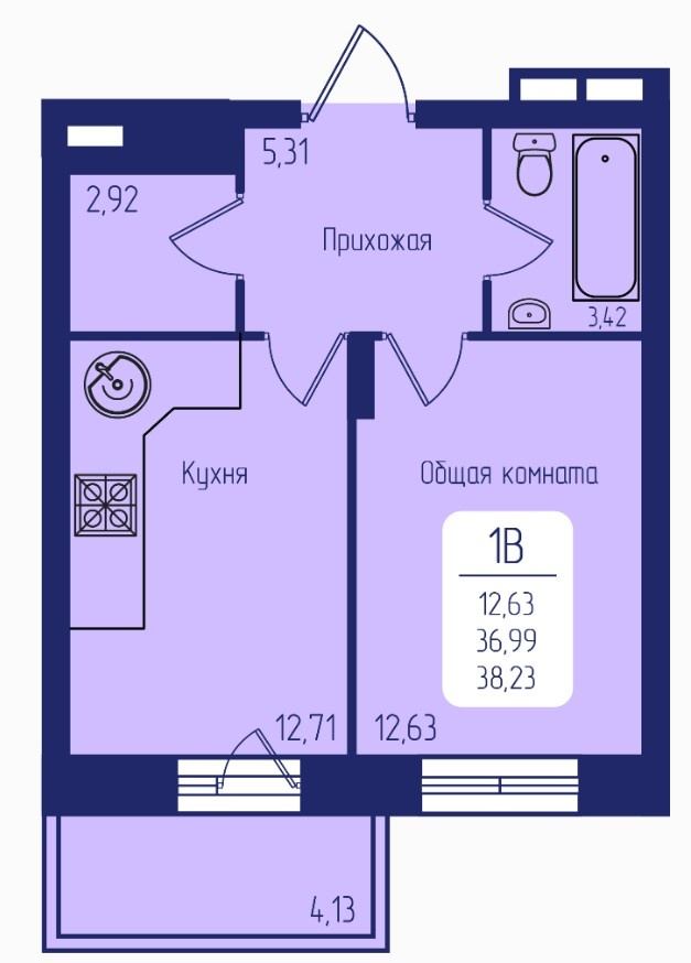 1-к квартира 38 м² на 9 этаже 25 этажного дома